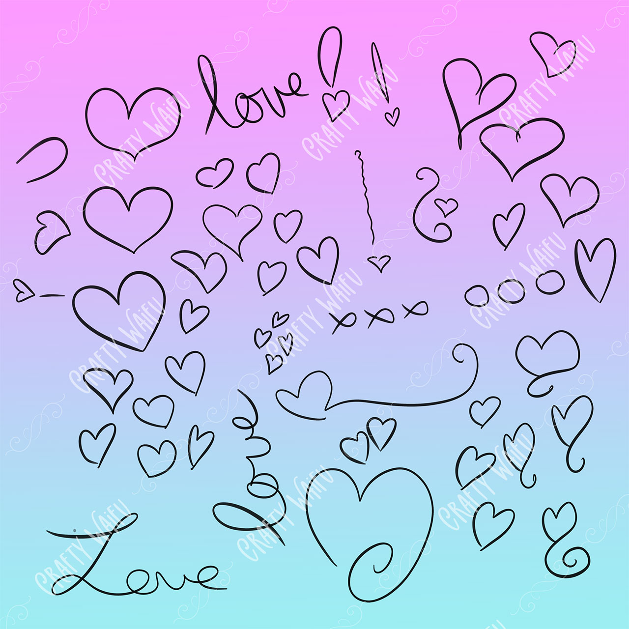 This sheet features a collection of hand-drawn hearts, swirls, arrows, and love-themed doodles created to feel organic, imperfect, and full of personality. Each element captures the casual charm of pen-on-paper sketches, making them ideal for designs that want to feel personal, cozy, or affectionately handmade rather than polished or mechanical.