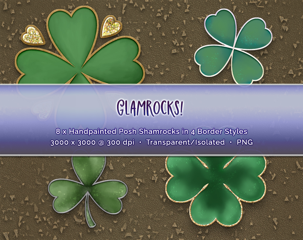 Glamrocks! is a collection of hand-painted shamrock designs with decorative borders that add a touch of sparkle and personality to your St. Patrick’s Day creations.