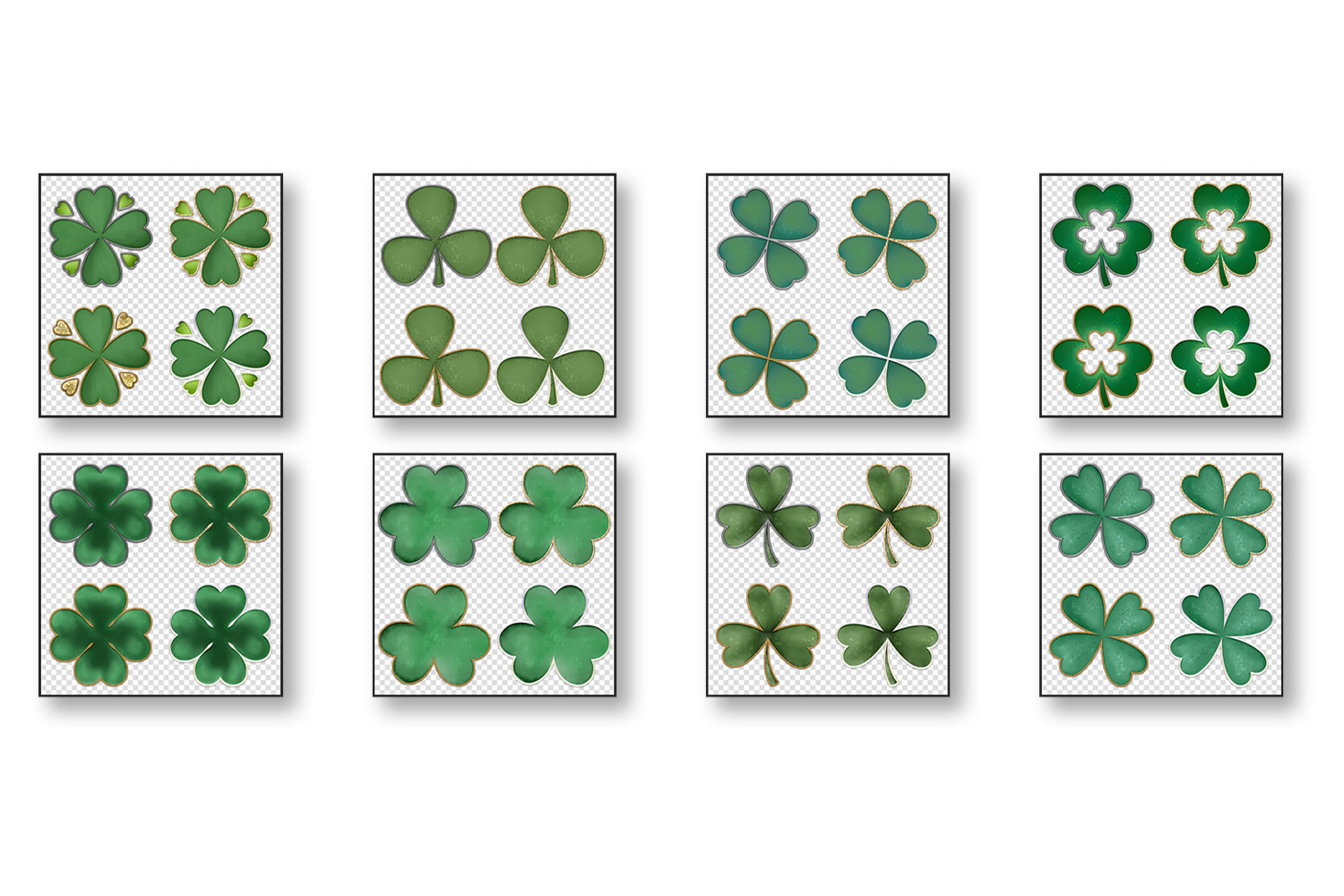 This set includes 8 unique shamrock designs, each presented in four border styles: